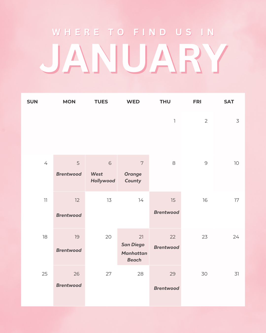 We are all over LA, Manhattan Beach, Orange County and San Diego monthly.